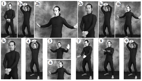 2b-c. Lower your hands in an outward circular motion to position 1 and exhale.